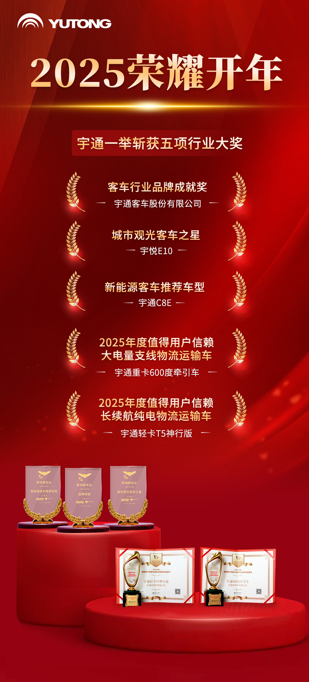 两大颁奖典礼、五项大奖,覆盖客车、重卡和轻卡三大业务板块,本次获奖展示了宇通在商用车领域全面发展的成果,多赛道齐头并进。2025年,宇通将继续踔厉奋发,以高质量发展落实中国式现代化的宇通实践。