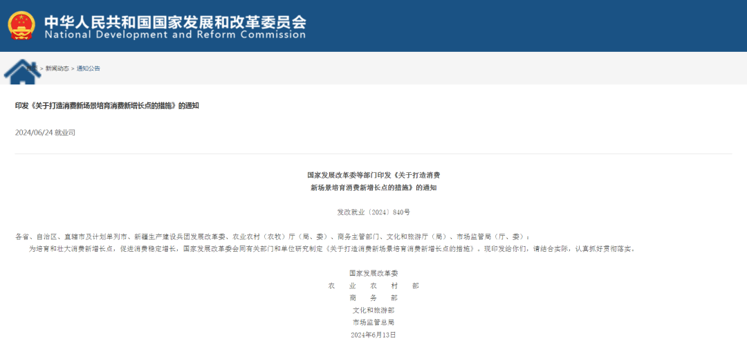 24日,国家发展改革委、农业农村部、商务部、文化和旅游部、市场监管总局等部门印发《关于打造消费新场景培育消费新增长点的措施》。