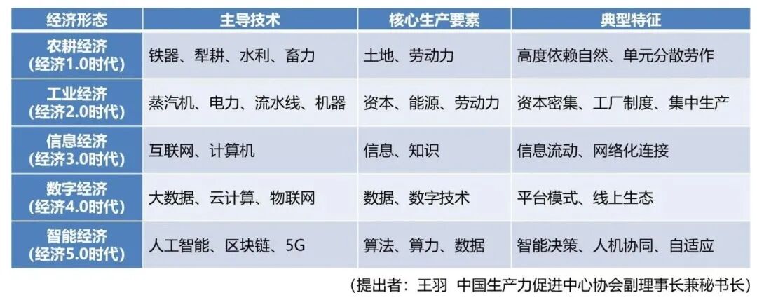 从经济形态演进的角度看,智能经济是数字经济的高级形态和典型代表。纵观人类发展至今,经济可以划分为五个时代。其中,以农耕经济代表的时代可称为经济1.0时代,以工业经济为代表的时代可称为经济2.0时代,以信息经济为代表的时代可称为3.0时代,以数字经济为代表的时代可称为经济4.0时代,而以智能经济为代表的时代可称为经济5.0时代。发展新质生产力,比较核心的主线任务就是推动数字经济迈向智能经济。从演进逻辑看,信息经济构建了基础网络通道,让数据得以流动;数字经济将这些数据转化为生产要素,催生了平台模式和线上生态;而智能经济则在前两者的基础上,实现从“连接”到“赋能”的飞跃。