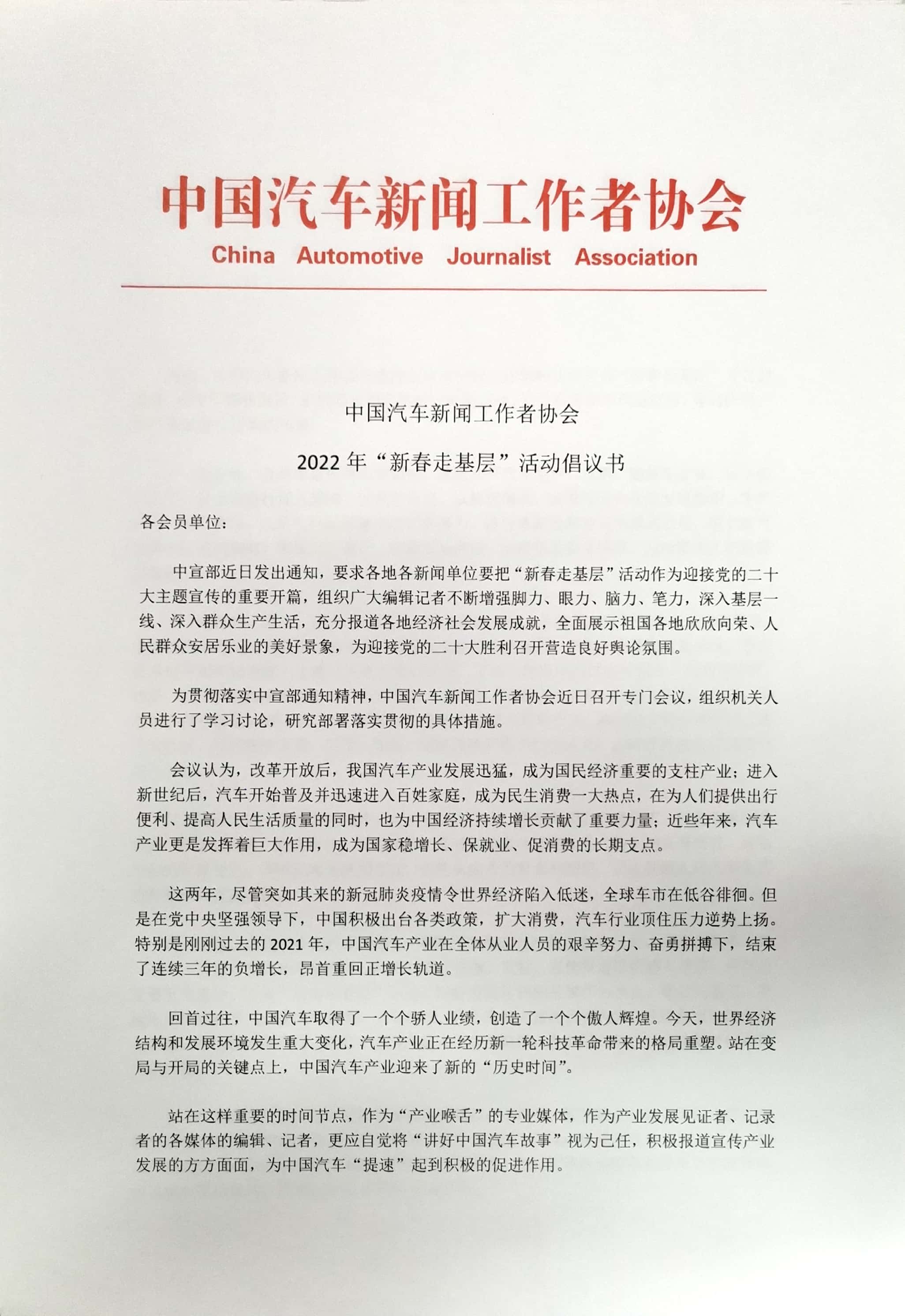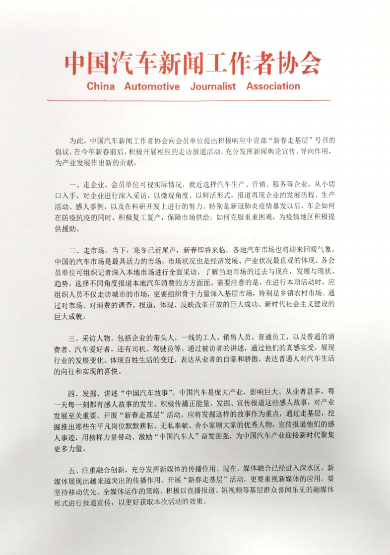 为此,中国汽车新闻工作者协会向会员单位提出积极响应中宣部“新春走基层”号召的倡议,在今年新春前后,积极开展相应的走访报道活动,充分发挥新闻舆论宣传、导向作用,为产业发展作出新的贡献: